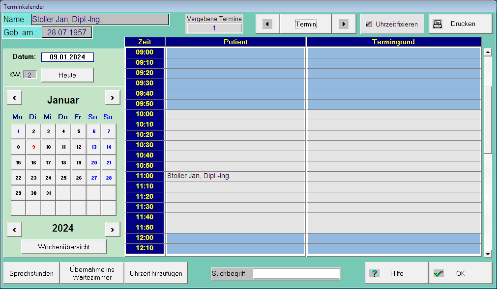 Sie wählen das Formular Terminkalender, suchen das entsprechende Datum für den nächsten Termin aus (bzw. lassen sich automatisch den nächsten freien Termin aussuchen), klicken auf die Uhrzeit und auf dem Schalter Termin - und der Termin für diesen Patienten wird automatisch registriert und kann wieder schnell herausgefunden werden.
